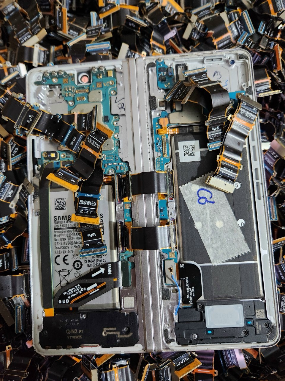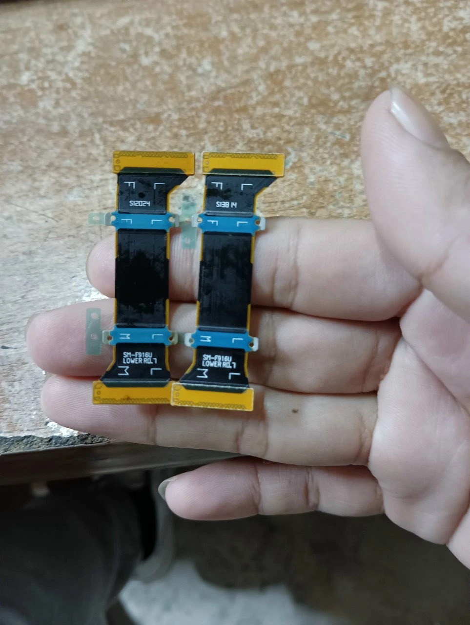 - Giữa 2 phần màn trong của điện thoại Samsung Z fold 5 có 1 sợi dây cáp gọi là cáp gập hoặc cáp nối main. Cáp này có chức năng kết nối 2 phần của màn hình với các bộ phận khác của máy như pin, loa, mic, wifi.